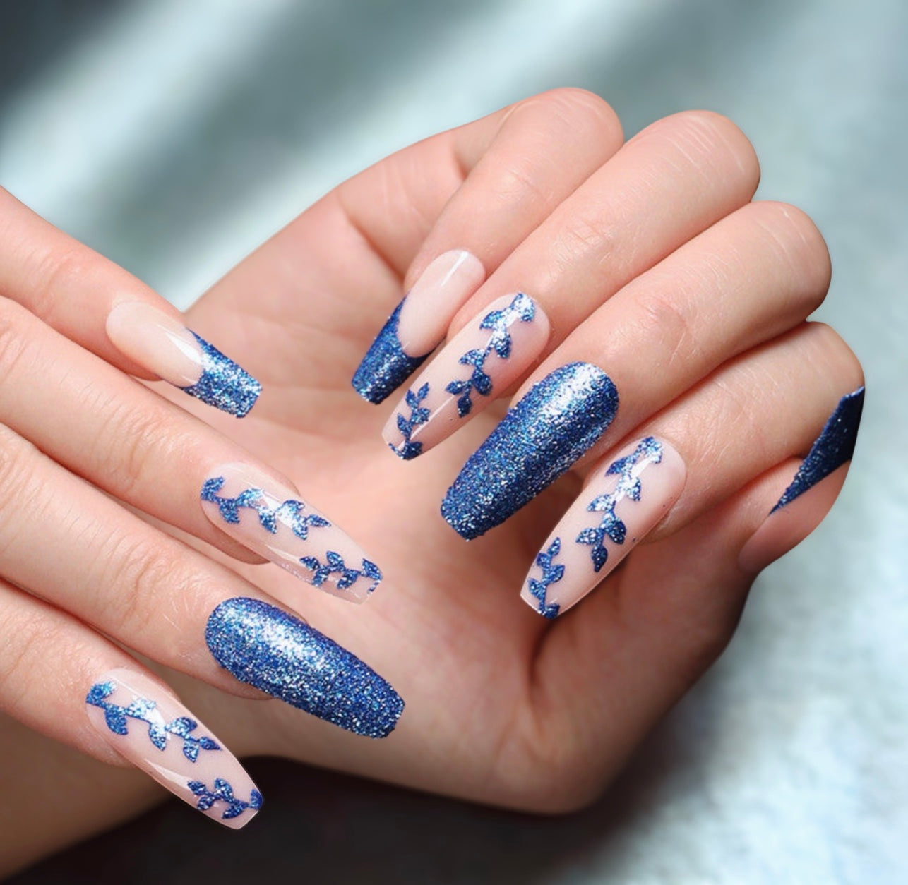 Elevate your style with detailed vine patterns and high-intensity sapphire glitter.